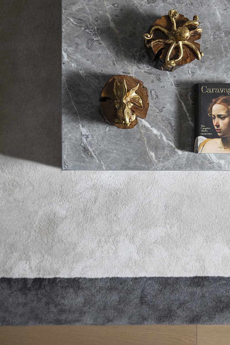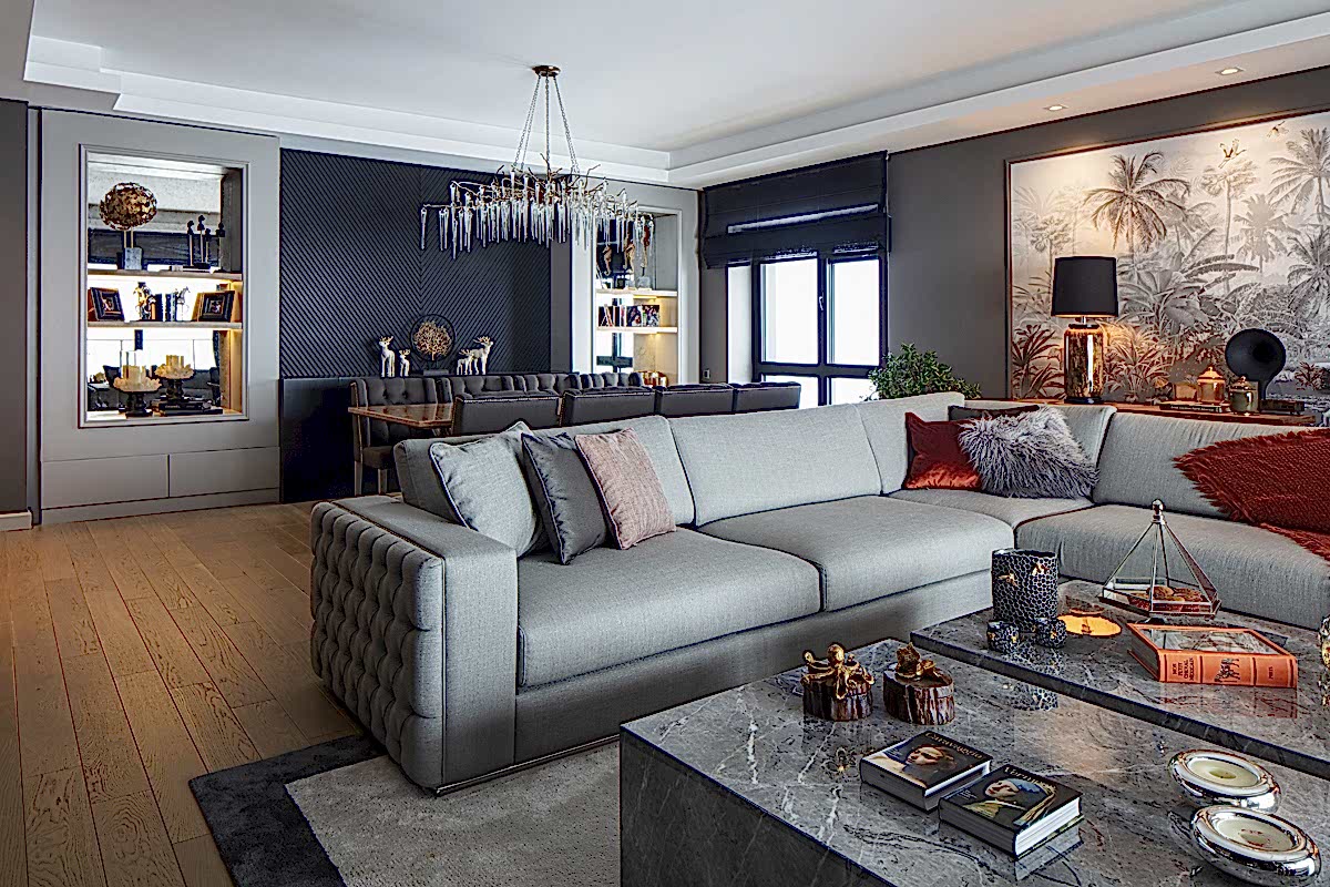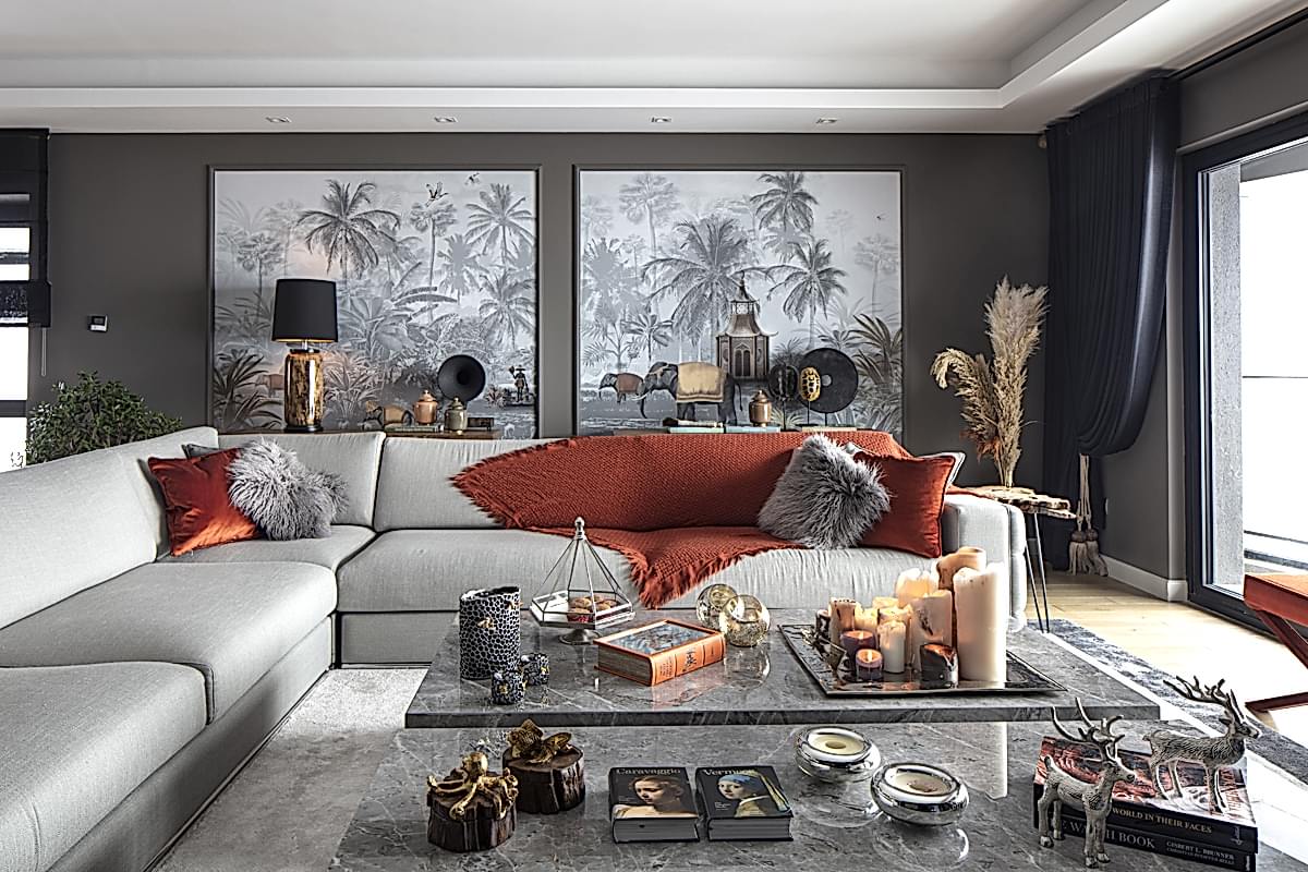 Odak noktasında; projeye özel olarak tasarlanan duvar kağıdının yer aldığı salonda; grinin birçok farklı tonu iyi bir denge içerisinde kullanılmıştır. Yanık tarçının sıcak tonu, kürklü ve pamuklu kumaş dokuları ile dekorasyonda kullanılan çok sayıdaki mum oldukça davetkar bir atmosfer yaratırken; büyük bir ebatla planlanan kütlesel mermer yüzey ile iyi bir kontrast yakalanmıştır.