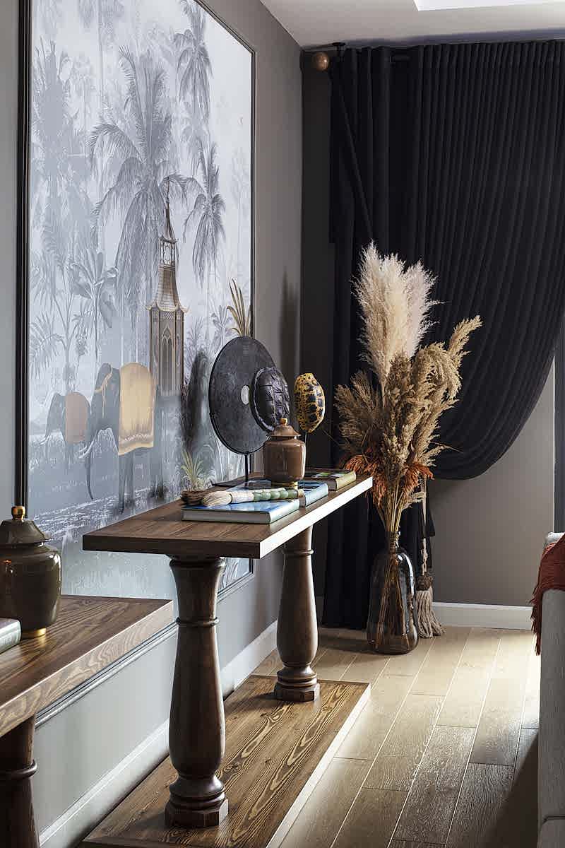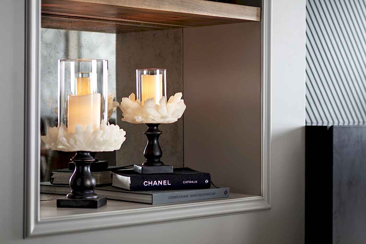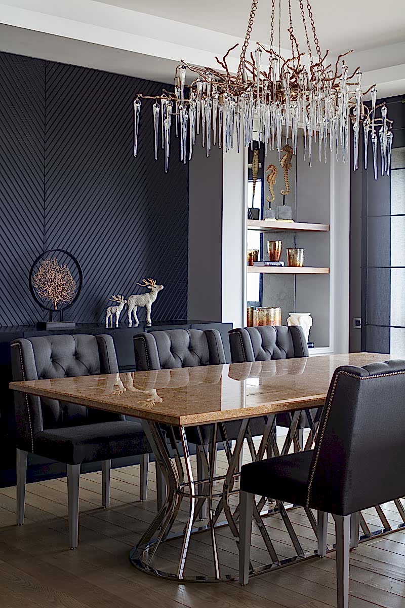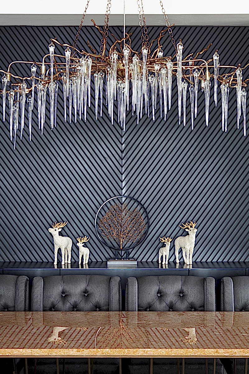 Odak noktasında; projeye özel olarak tasarlanan duvar kağıdının yer aldığı salonda; grinin birçok farklı tonu iyi bir denge içerisinde kullanılmıştır. Yanık tarçının sıcak tonu, kürklü ve pamuklu kumaş dokuları ile dekorasyonda kullanılan çok sayıdaki mum oldukça davetkar bir atmosfer yaratırken; büyük bir ebatla planlanan kütlesel mermer yüzey ile iyi bir kontrast yakalanmıştır.